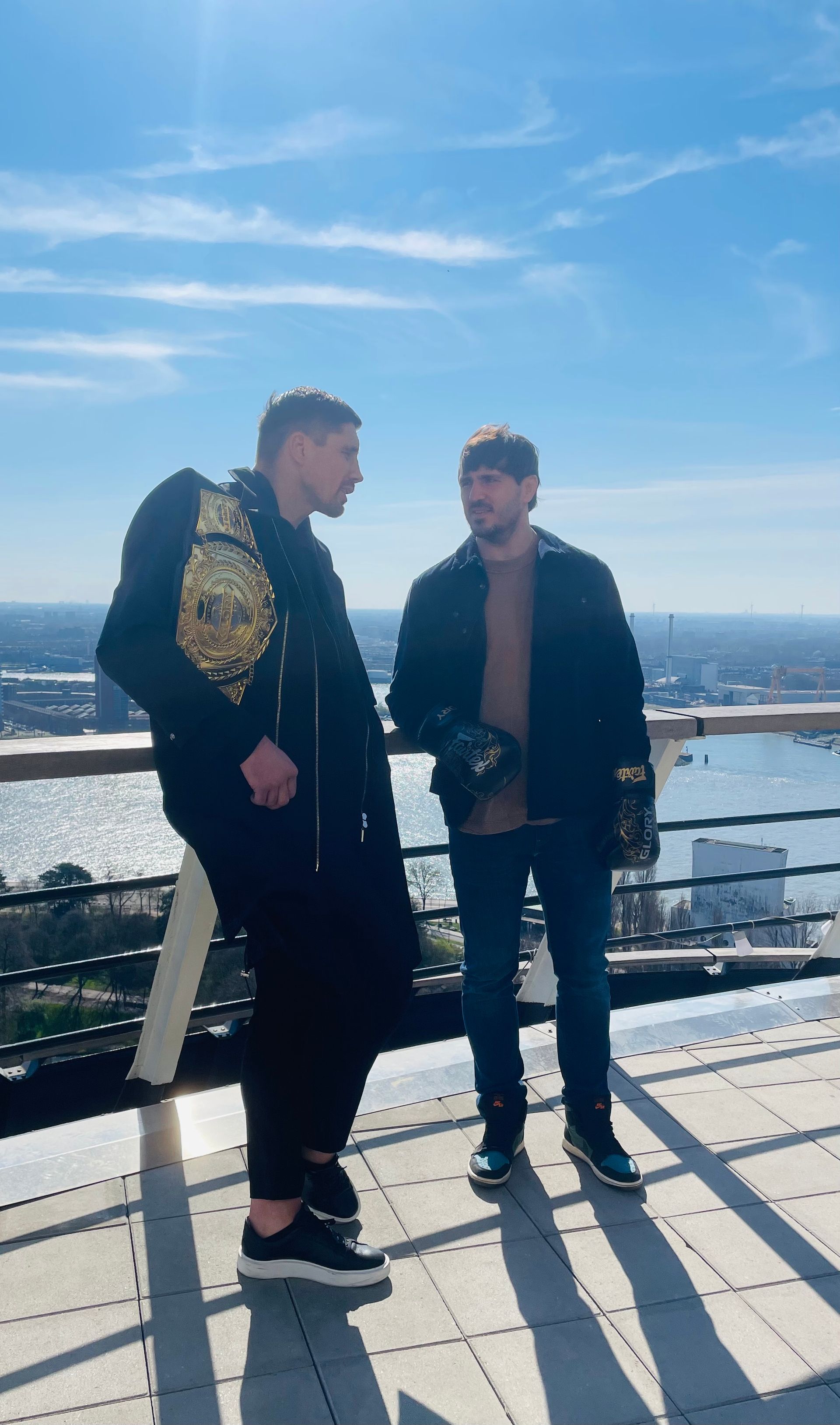 Dronebeelden brengen de promo voor het GLORY100 event in Ahoy tot leven, met Rico Verhoeven en Artem Vakitov hoog boven op de Euromast.